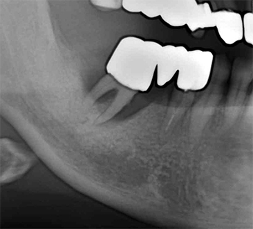 歯根破折(神経をとった歯は神経が生きている生活歯より弱く、疲労破折することが多い)により抜歯が必要な場合に、抜歯と同時にインプラントを埋入するケースです。歯根破折した歯は破折部位に細菌がたまり炎症の原因になるため早めに抜歯を行わないと、骨が溶けていきます。