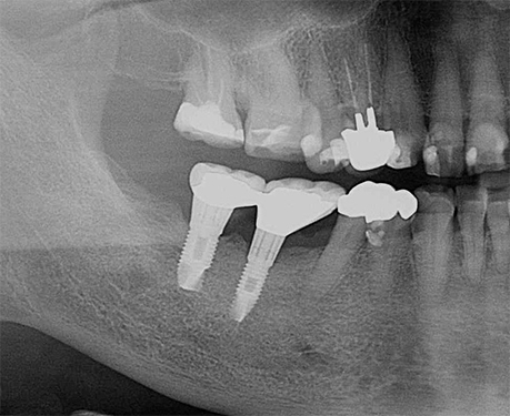 右下のブリッジを支える歯が重度歯周炎と歯根破折によりグラグラになり、抜歯後デンタルインプラントで治療しました。